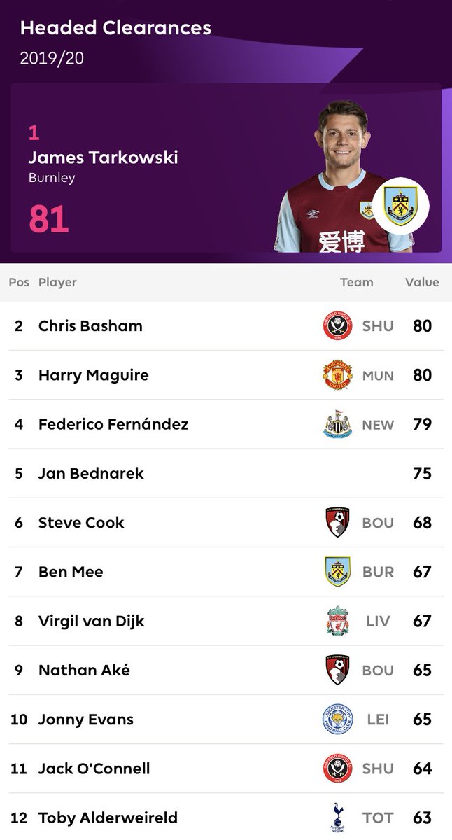 اكثر اللاعبين تخليصا للكرات الهوائية بالراس في البريميرليغ موسم 2019-2020 حتى الان /