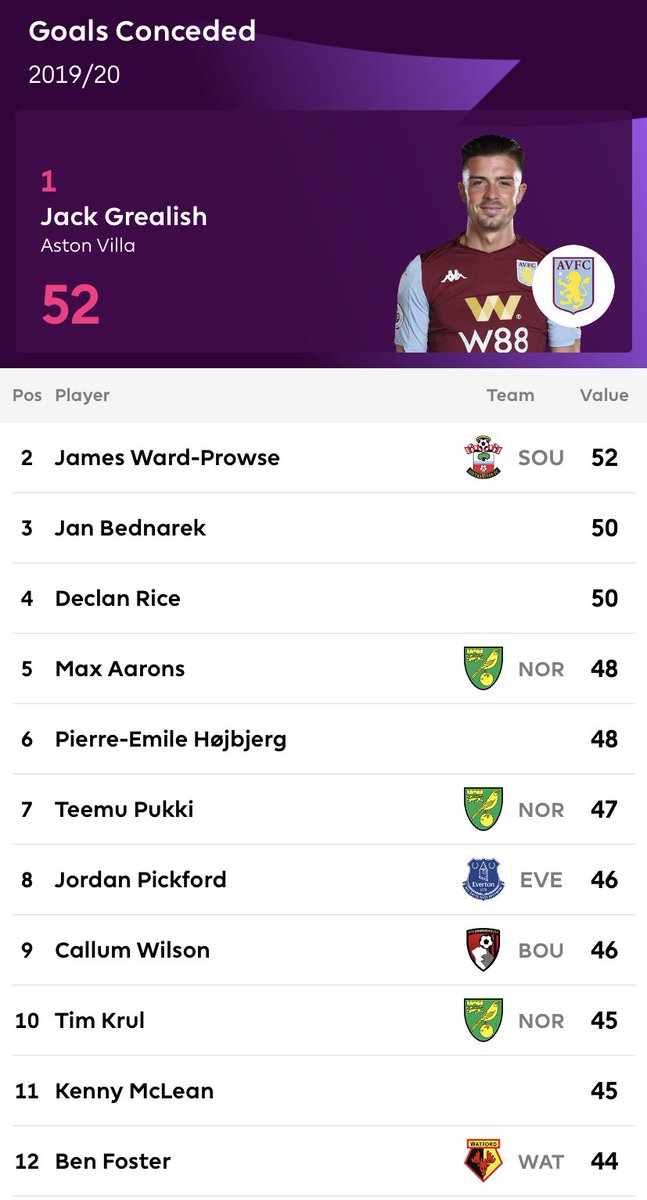اكثر اللاعبين استقبالا للاهداف في البريميرليغ موسم 2019-2020 حتى الان /