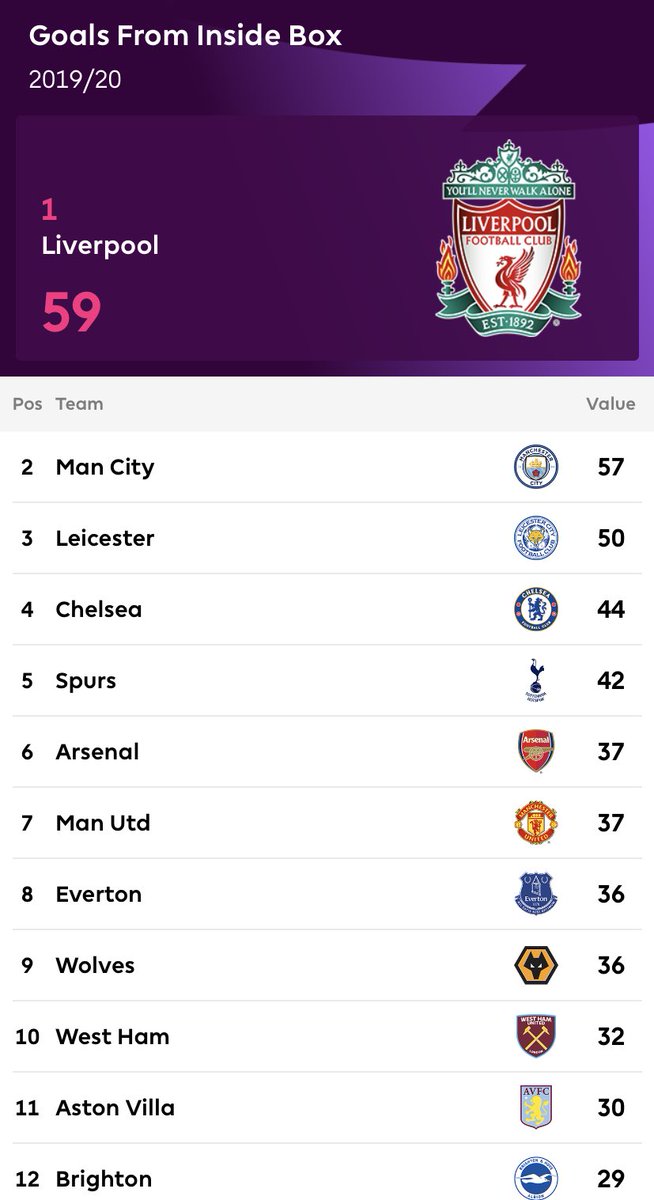 اكثر الفرق تسجيلا للاهداف من داخل صندوق 18 في البريميرليغ موسم 2019-2020 /