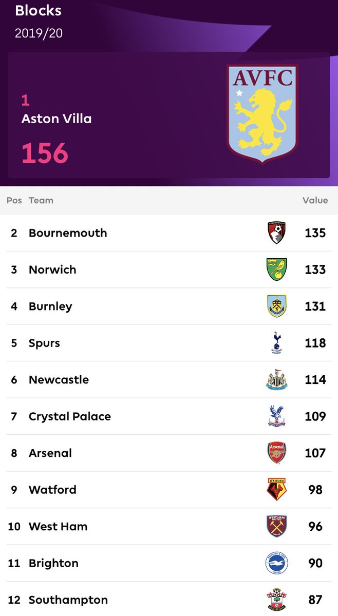 اكثر الفرق اعتراضا للكرات في البريميرليغ موسم 2019-2020 /