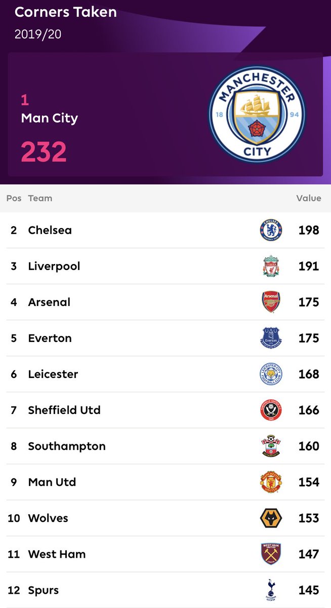 اكثر الفرق تنفيذا لضربات الزاوية في البريميرليغ موسم 2019-2020 /