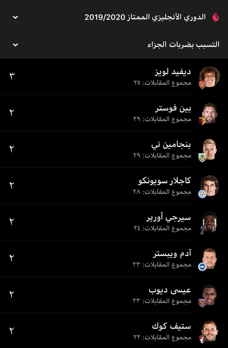 اكثر اللاعبين تسببا لضربات الجزاء في البريميرليغ لموسم 2019-2020 حتى الان /