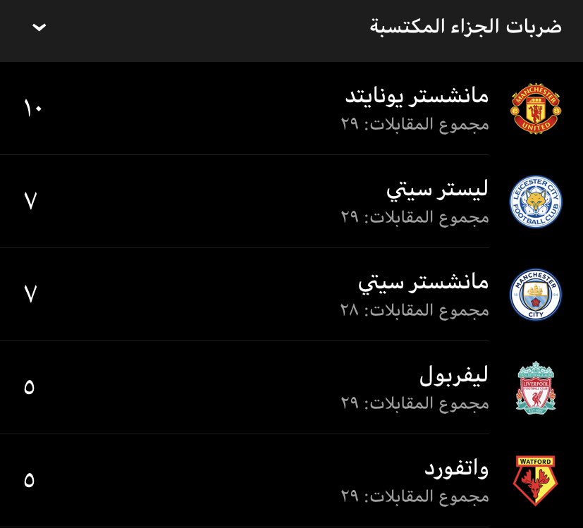 اكثر الفرق تحصلا على ضربات الجزاء في البريميرليغ موسم 2019-2020 حتى الان /