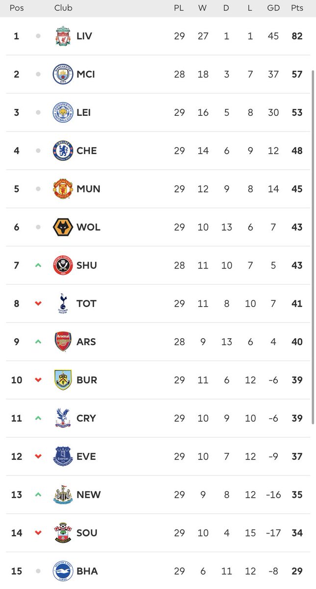 ترتيب البريميرليغ موسم 2019-2020 حتى الان /