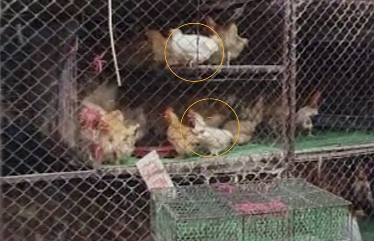 وعند نقلها الى سوق #يوهان تُنقل في سيارة واحدة وعند وصولها توضع داخل أقفاص حديدة تعلو بعض، فيبول ويغوط بعضعها على بعض مما يزيد من احتمالية إنتقال وتلاقح الفيروسات من كائن لآخر..