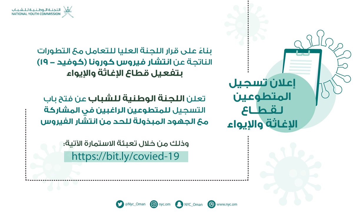 تلبية للنداء الوطني في دعم الجهود المبذولة للحد من انتشار #فيروس_كورونا_المستجد ندعو من يستطيع من شبابنا للتطوّع والمشاركة في جهود قطاع الإغاثة والإيواء من خلال تعبئة الاستمارة التالية؛ قبل 10 مساءً من يوم الخميس 26 مارس 2020م ✨💪🏻🦠