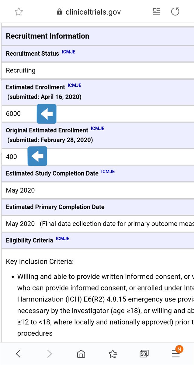 📝اذا ظهرت نتائج ايجابية للدراسات الاكلينيكية المرتقبة على400شخص، بالاضافة إلى دراسة سابقة(انظر اعلاه)، ممكن منح الدواء إجازة استخدام وفق بند الطوارئ (ليس اعتماد) خلال شهر من ظهور النتائج