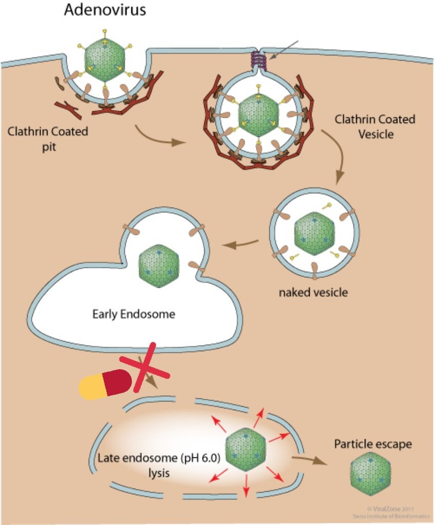 🏵بعد التصاق الفيروس في الخلية، يدخل بداخل جسيم خلوي اسمه الاندوسوم المبكّرEEالذي ينضجLate endosomeفيطلق حمضه النووي🧬في الخلية للتكاثر