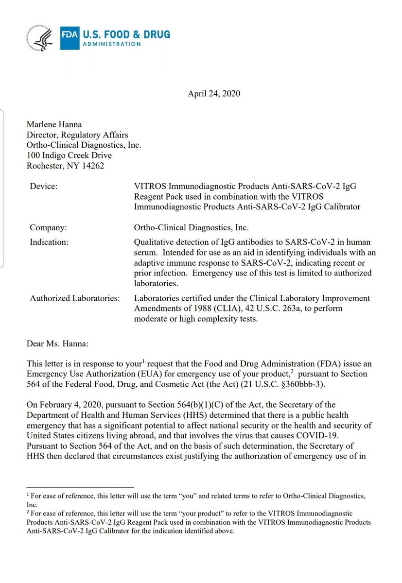 هيئة الغذاء والدواء تجيز فحص الأجسام المضادة لكوفيد-١٩ VITROS