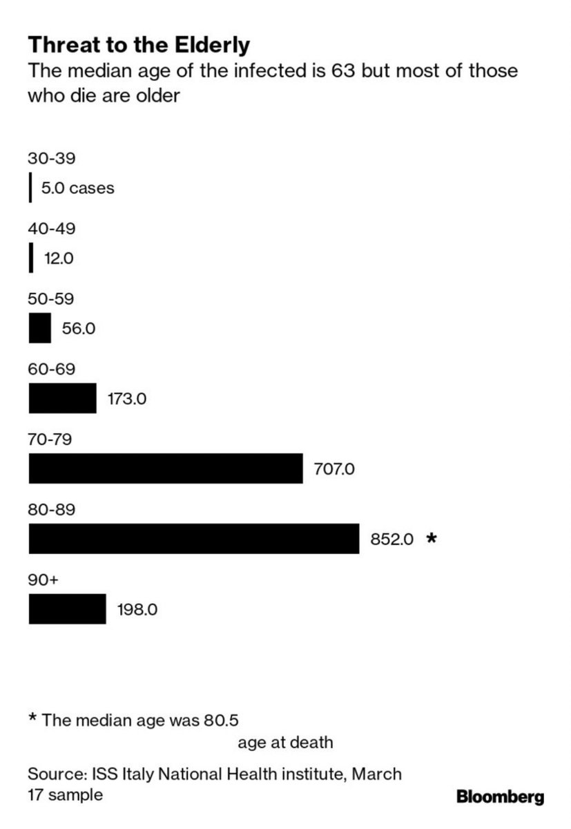 معدل أعمار الوفيات في إيطاليا هو ٧٩ سنة تقريبًا. تحت ال٥٠ سنة توفي فقط ١٧ شخص وكانوا جميعهم يعانون من أمراض مزمنة قبل إصابتهم بكورونا. الصورة في الأسفل توضح عدد الوفيات مع فئة الأعمار.