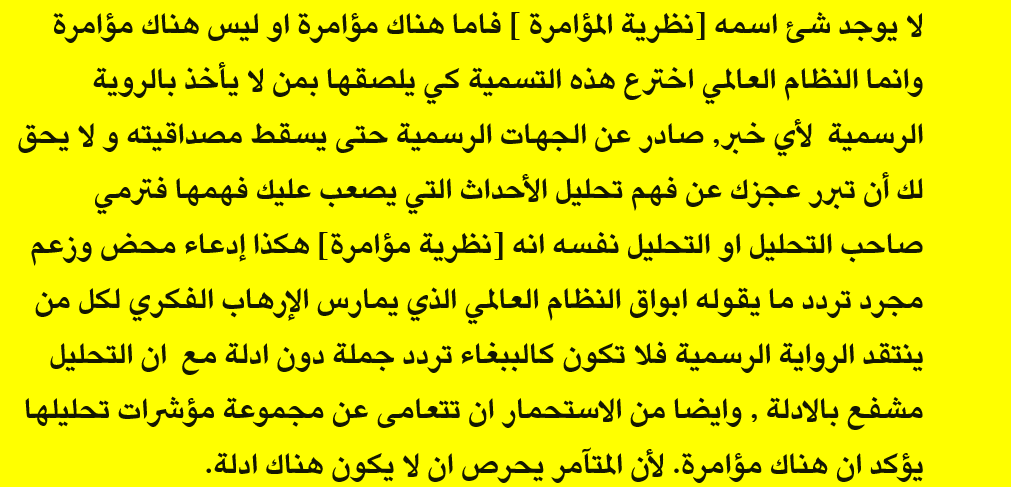 @hmdyacine4 لا يوجد شئ اسمه [نظرية المؤامرة ] فاما هناك مؤامرة او ليس هناك مؤامرة وانما النظام العالمي اخترع هذه التسمية كي يلصقها بمن لا ياخذ بالروية الرسمية لاي خبر حتى يسقط مصداقيته