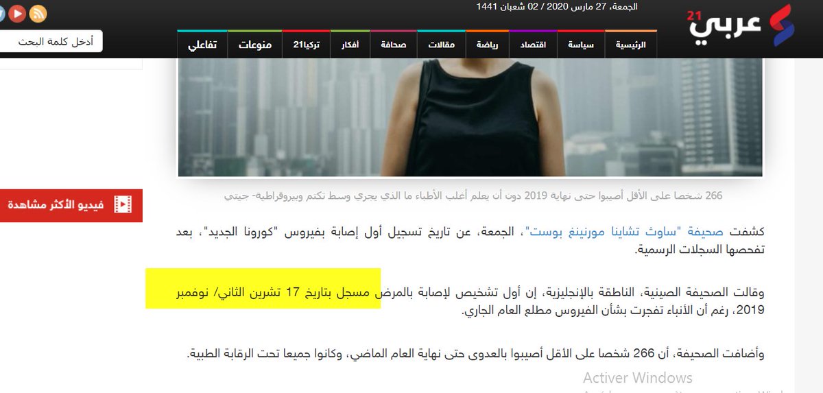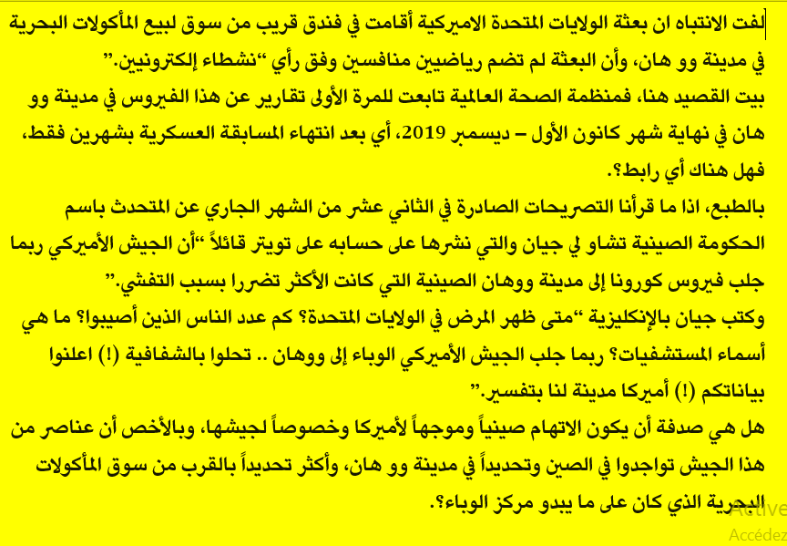 17-تحدث صاحبالفيديو الذي كان يتحدث نيابة عن مجموعة من الخبراء عن وجود بيانات ووثائق تؤكد ان فيروس كورونا هو فيروس صنع بمزج فيروس السارس وكورونا مؤكدا الفيروس ربما تم نشره او انه خرج من المخابر بطريقة عفوية وانه اليوم لا يمكن مواجهته خوفا من التبعات وتهم نشر المرض