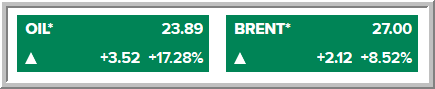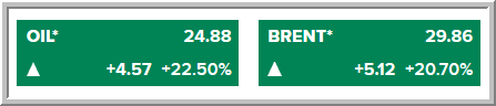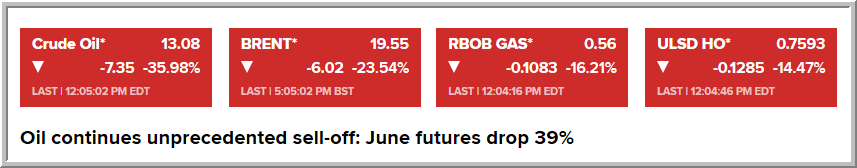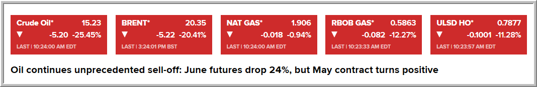 يرجى الانتباه يا اخوان .. هذا سعر عقود شهر مايو الذى يسعر بسالب 35$ للبرميل .. في حين ان أسعار شهر يونيو هي 21 دولار للبرميل على تراجع 16% ، ومزيج برنت على تراجع 7% عند 26$ للبرميل ..