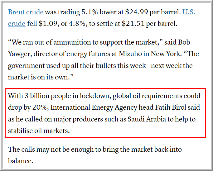 هنا "رئيس وكالة الطاقة الدولية" في 2020/3/26 يقدر بأن يتراجع الطلب العالمي على النفط بمقدار 20%، وهذا ما سبق ان قدرناه قبل فترة بدقة ..