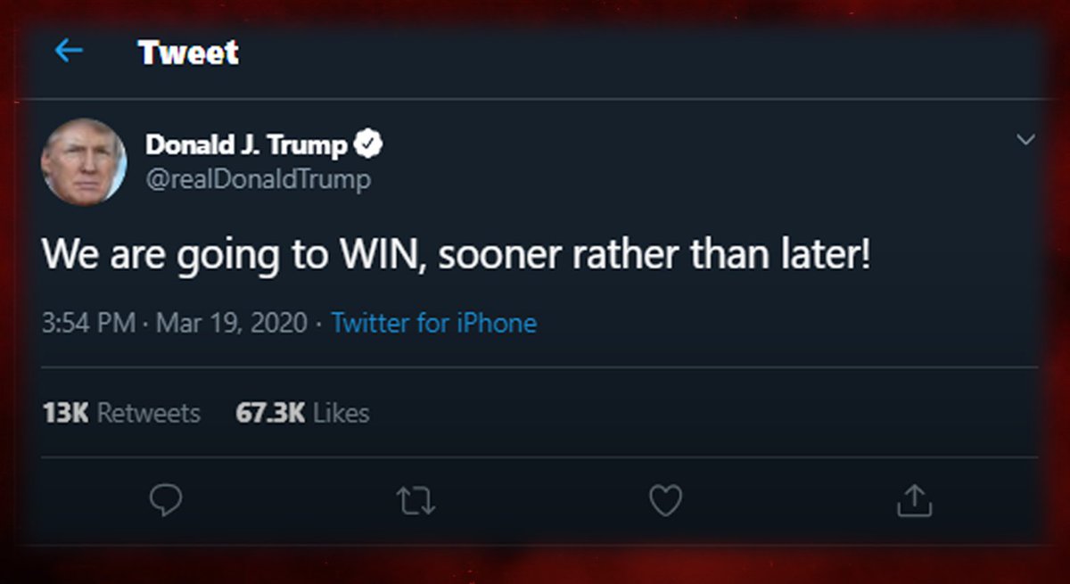 واحد من الصحفيين صور خطاب ترامب أثناء إلقاء ترامب له، واكتشف ان ترامب شطب على احد الكلمات في الخطاب المطبوع وكانت هذي الكلمة ( Corona ) وكتب مكانها ( China ) .. عشان يصير اسم الوباء ( الفيروس الصيني ) حتى بالأوراق الرسمية