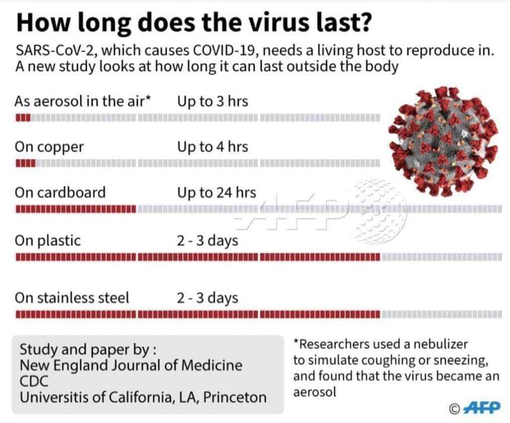 قابلتكم الدراسة الاتعملت دي !؟؟؟دي دراسة اتعملت بتقيس المدة الزمنية البيقعد فيها الفيروس ع الاسطح بمختلف انواعها ... لقوا انه مثلا في الاسطح البلاستيكية بيقعد لمدة 72س وهكذا ... الدراسة دي وضحت انه الفيروس بالuv light والheat بيحصل ليهو destroy بعد ساعات .
