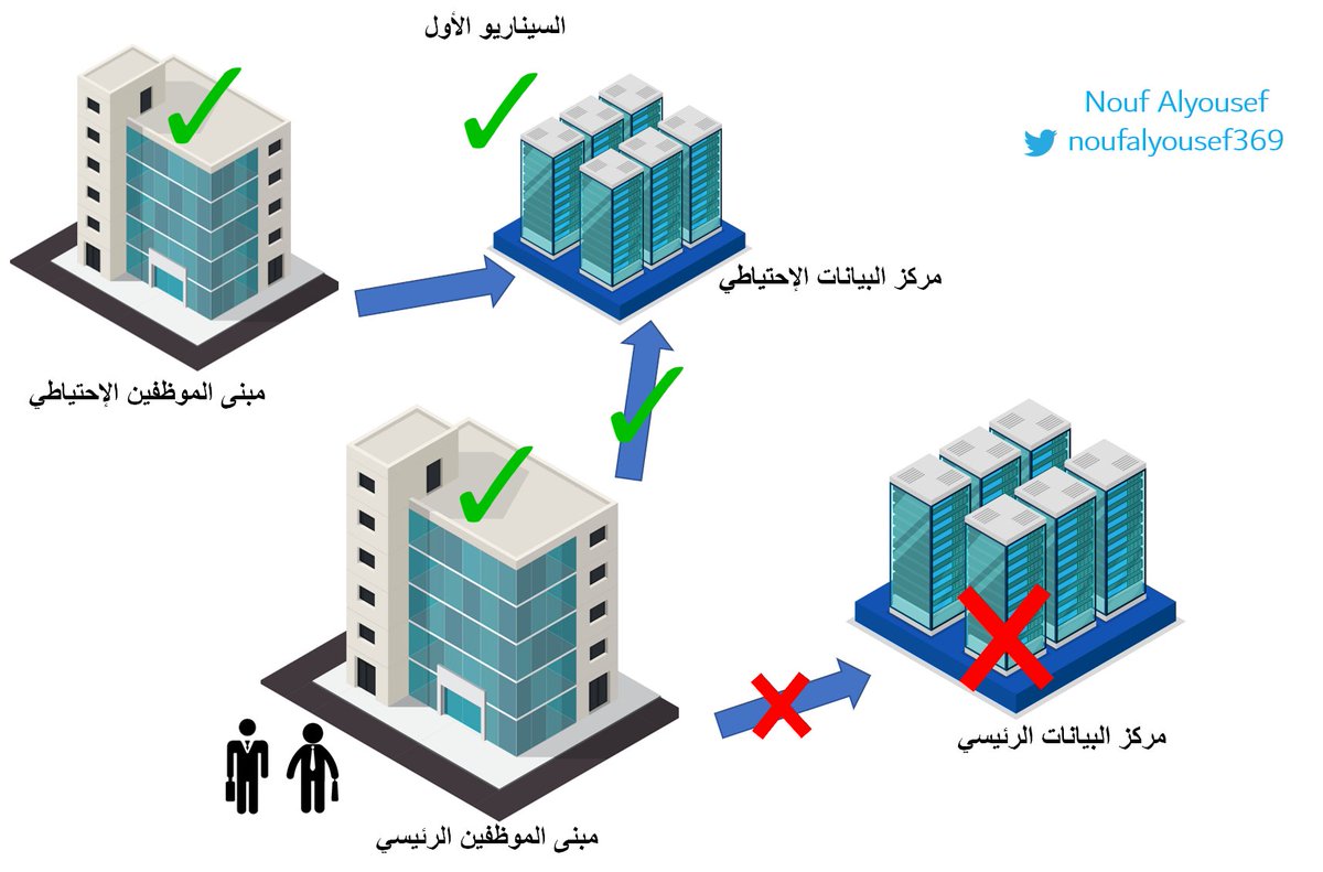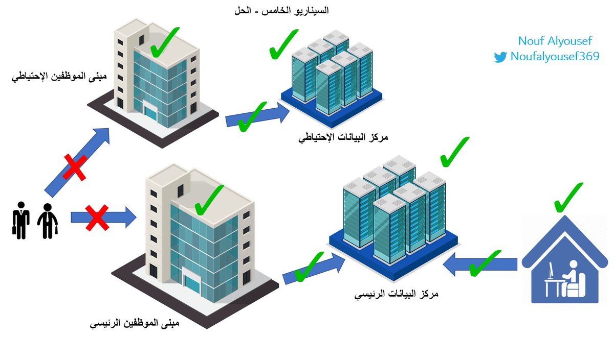 الحل : يتم إتخاذ القرار من قبل لجنة إدارة الأزمات المكونة من أعضاء الإدارة العليا وقادة التقنية وملاك البيانات المتأثرين بتحويل وربط العمل في المبنى الرئيسي بمركز البيانات الإحتياطي، لحين الإستجابة للحادثة وعودة مركز بيانات الرئيسي للعمل مجدداً.