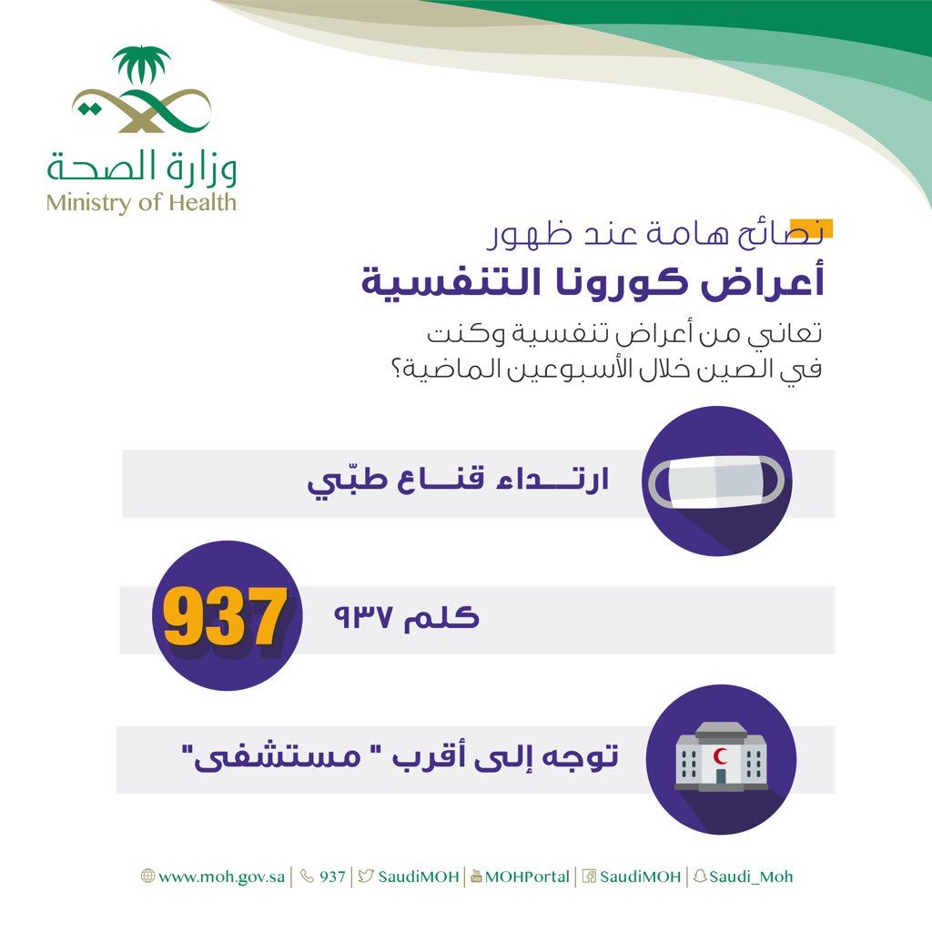 و الحجر المنزلي في غرفة خاصة مع لبس الكمام وعدم اقترابك من الاهل ثم توجهه لمستشفي والاتصال برقم ٩٣٧