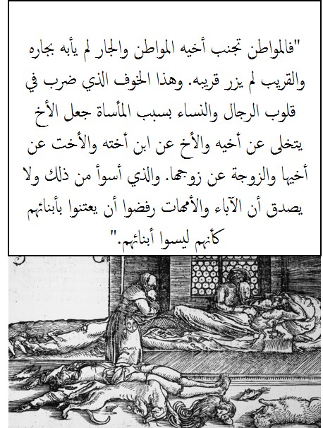 ملاحظة: الترجمة كانت لمتقطفات من كتاب Decameron لمؤلفه الإيطالي جيوفاني بوكاتشيو والذي كان شاهد عيان لهذه الأحداث وكتبها. الكتاب تجدونه هنا: