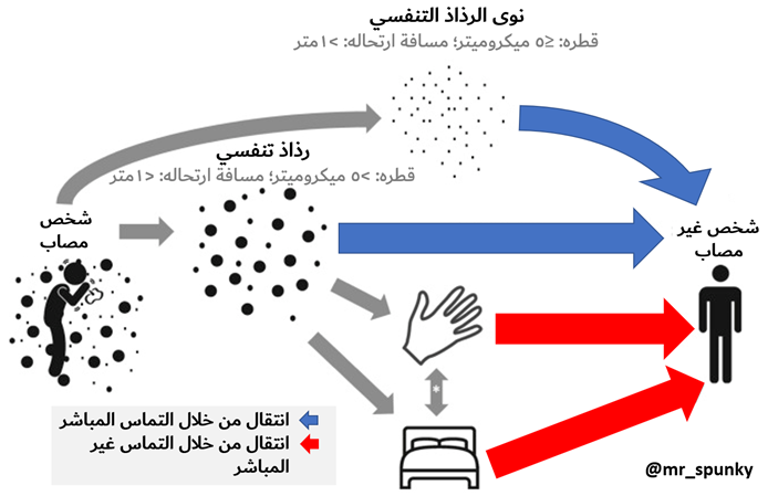 @AmalNadhreen 1- تنتقل الفيروسات التنفسية بشكل عام من خلال التماس المباشر (التعرض المباشر للرذار أو نوى الرذار الصادر من شخص مصاب) والتماس غير المباشر (بلمس الأنسجة العينين, الأنف أو الفم بيدين ملوثتين).