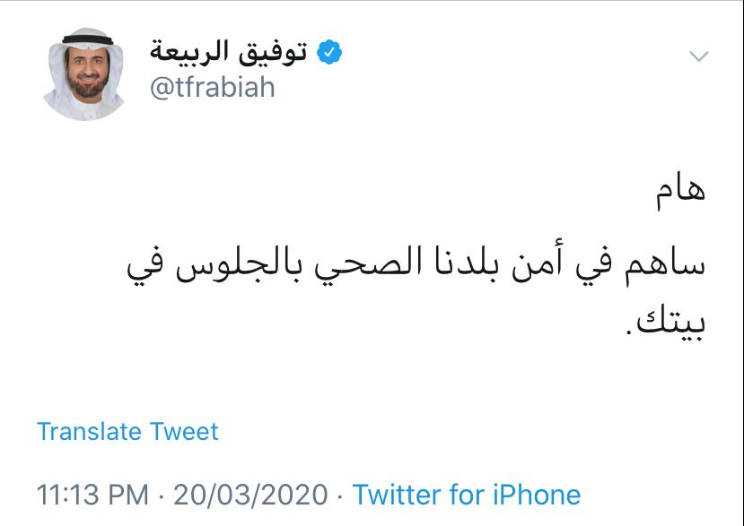 ظهر المُوفق @tfrabiah خلال الأزمة كمُمثل لرأس الهرم المسؤول عن إدارة الأزمة وبالتالي يتضح مدى أهمية الأمر وحرص القيادة العليا على أدق التفاصيل بمواجهة مباشرة وعمل واضح لاحتواء الأضرار ذات الأبعاد الصحية والاقتصادية والاجتماعية وغيرها