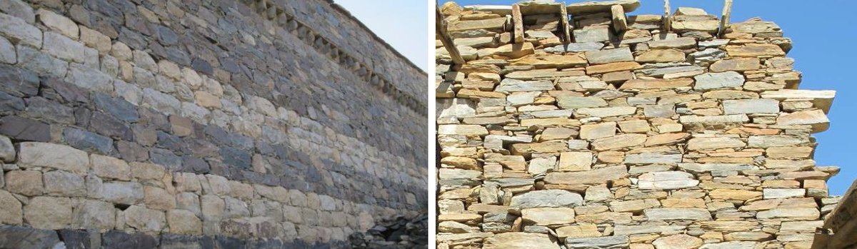 أهم مايميز جدران المباني في المنطقة هي الأحجار المحلية الصلبة والتي يصل سمكها للمتر وقد يزيد بحسب ارتفاع المبنى.