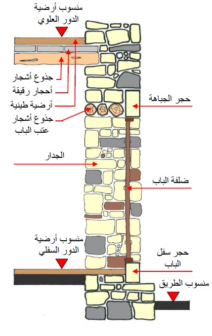 أما العتبات والجلسات فتستخدم كتل حجرية كبيرة بكامل عرض الفتحة من الخارج ويتم استخدام جدذوع الشجر من الداخل ثم توضع فوقه الأحجار.