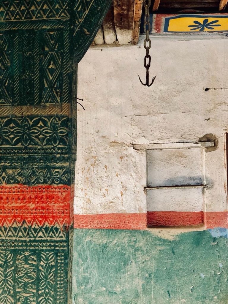 الفناء يتم احاطته بسور مبنى من الحجارة وفي أحد أطرافه توضع المئذنة التي ماتكون عادة بشكل اسطواني .