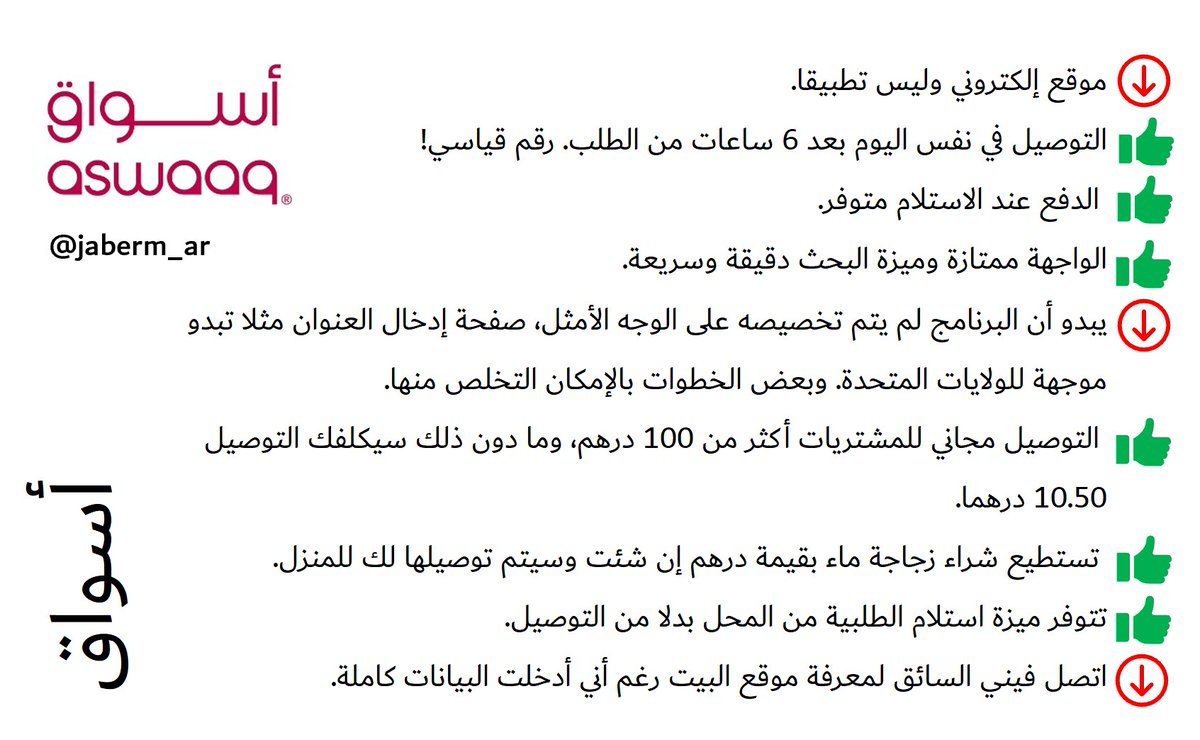 بشكل عام التجربة إيجابية. نعم أكثر الواجهات بدائية لكن مع قليل من الصبر وبعض التخطيط المسبق تغنيك هذه التطبيقات عن ضرورة زيارة المتاجر شخصيا، فحتى اللحوم والفواكه الطازجة متوفرة للشراء إلكترونيا والتوصيل للمنزل.