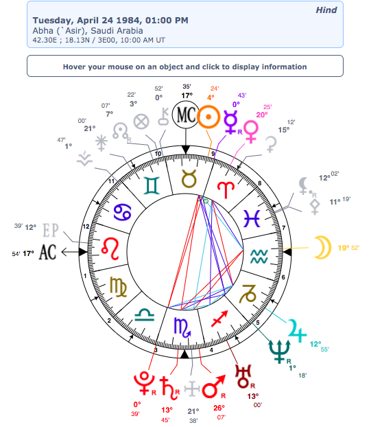 حاكم البيت العاشر بالبيت التاسع، وهو الزهرة كوكب الحب والجمال، هند لما تسافر الناس تمدحها والأجانب ينعجبون فيها بسهولة وواضح انهم يبدون اعجابهم فيها بدون خجل خصوصا بعيونها وانفها، اتصل حاكم عاشرها بالمريخ بالبيت الرابع، أي حد يعاديها بالسوشال ميديا تقدر تطلع اسراره بسهولة وتفضحه