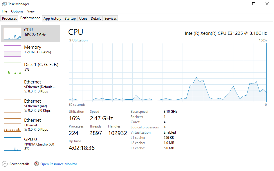 الشاشة خاصة بالCPU الUtilization هي مقدار الاستفادة الحالية من قدرة المعالج و هي هنا فقط 16%. الSpeed هي سرعة المعالج و مكتوب 2.47 GHz, لكن لاحظ في الأعلى مكتوب ان سرعة المعالج هي 3.10GHz !؟. هذا لأن ويندوز لا يريدك أن تستهلك كهرباء اكثر من حاجتك فجعله السرعة متغيرة حسب الحاجة .