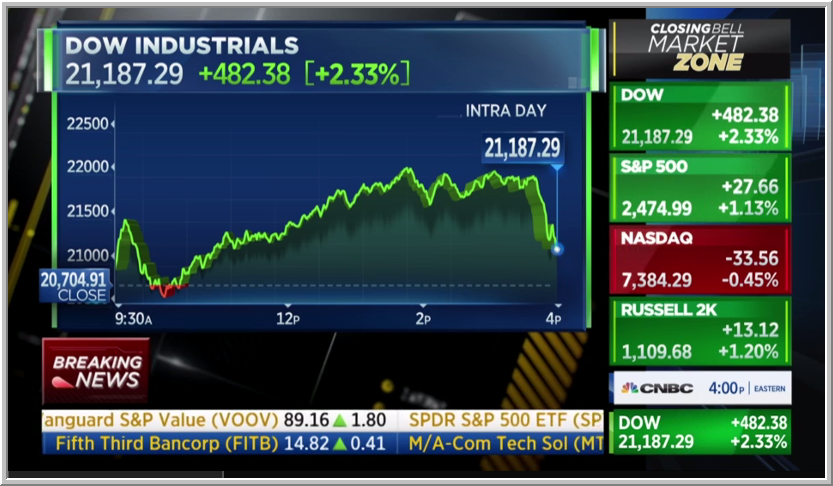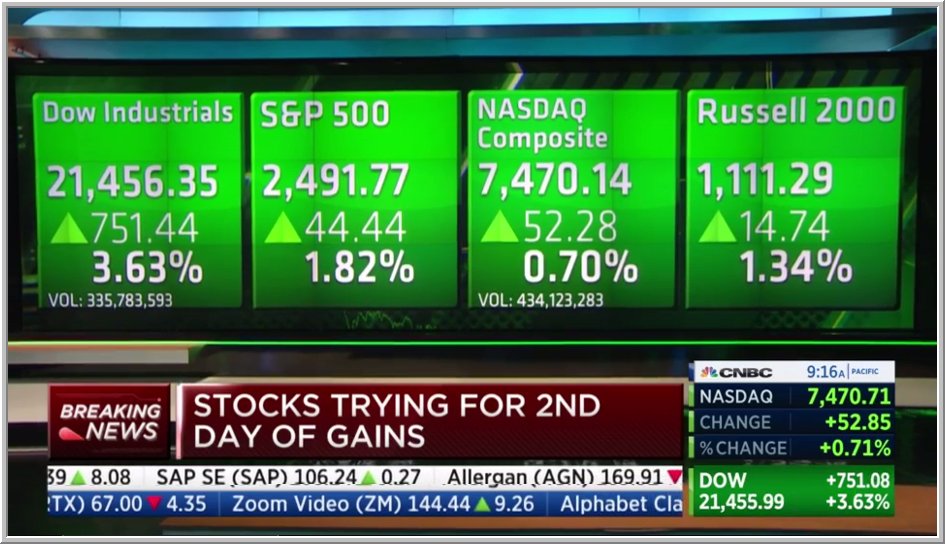 المؤشرات الامريكية تفتح جلسة الأربعاء على ارتفاع كبير ، داوجونز علي ارتفاع 600 نقطة، مدعوما بارتفاع بوينج بقرابة 18% ، اسعار النفط على تراجع ، ومزيج نايمكس على تراجع 2% عند 23.60$/برميل