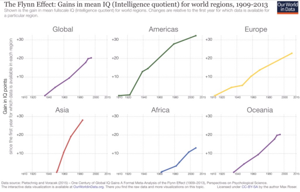 رغم أن اختبار الذكاء يتم تحديثه ليلائم كل جيل إلا أنه وجد أنه لو خضع جيلنا الحالي لمقاييسهم قبل مائة عام فإن متوسط الدرجات في اختبار الذكاء سيكون 130 درجة و هو الحد الفاصل بين الشخص العادي و الموهوب و هذا يعني أن معظمنا موهوبين بمقاييسهم.
