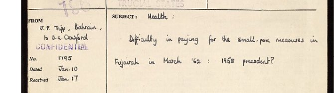 ٧- و في محاولة لتقصي تاريخ الأوبئة الحديث في الدولة، وبينما العالم الغربي يتخلص من الجدري، رصدت الحالات في الجزيرة العربية و بعضها في ساحل الإمارات المتصالحة إلى قبيل الاتحاد، حيث تشير الوثائق البريطانية لوجود حالات الجدري في الساحل الشرقي.
