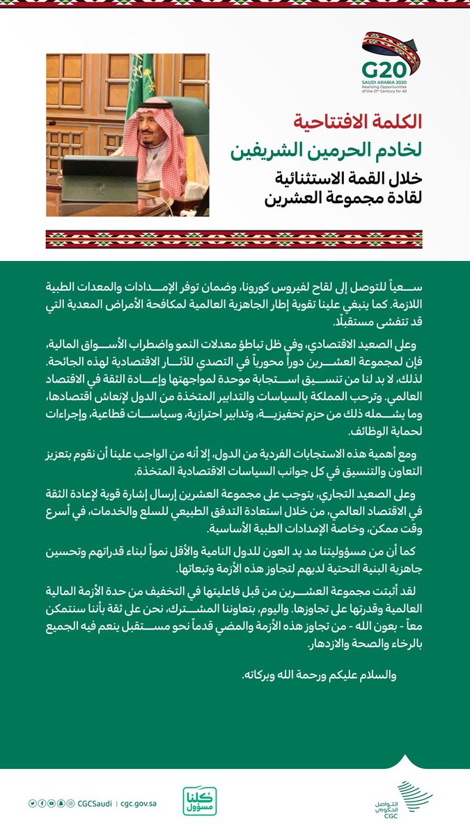 لذلك .. جاءت كلمة #الملك_سلمان_بن_عبدالعزيز في هذه القمة .. لتعيد ترتيب الاولويات و لتذكر القادة بواجبهم و بمسؤوليتهم امام العالم . #هي_ازمة_إنسانيه و تتطلب #استجابه_عالمية .