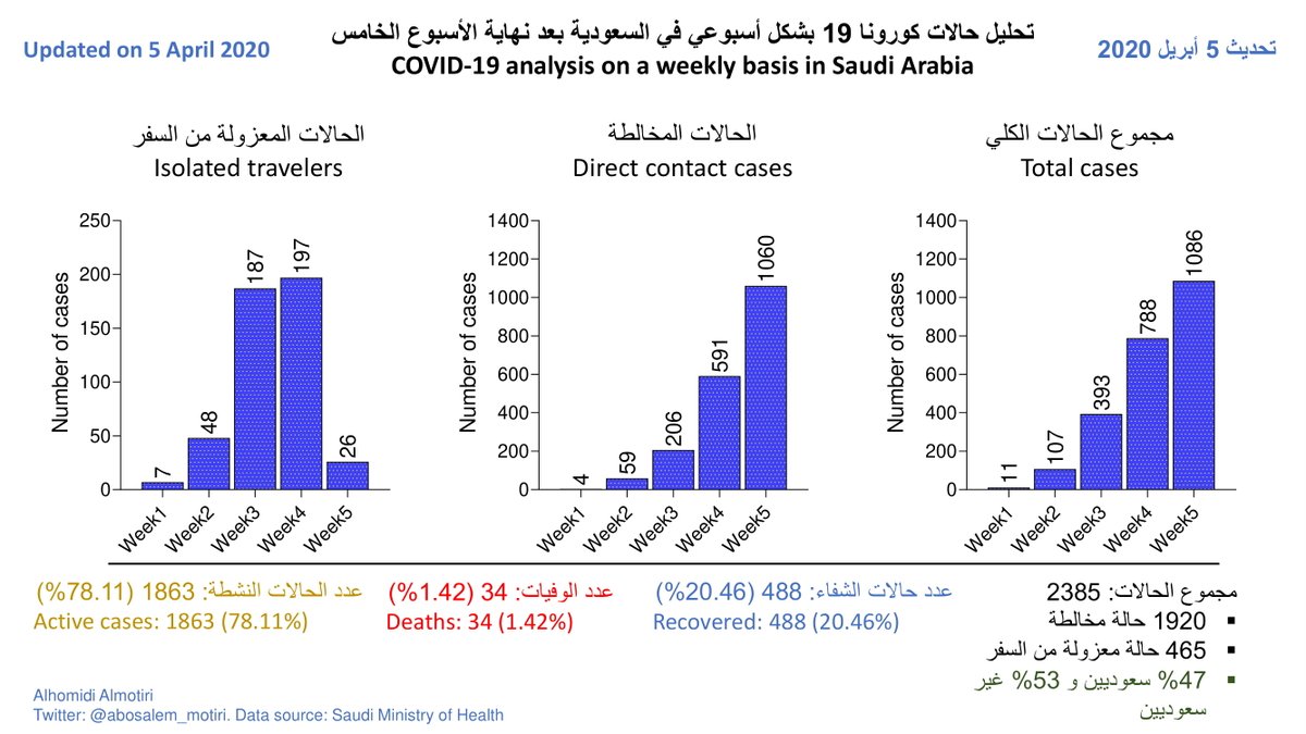 وصلنا لنهاية الأسبوع الخامس فعرضت الحالات بشكل أسبوعي لتكون الصورة أوضح (حالات السفر, حالات المخالطة, الحالات كاملة).ملاحظ جدا أن الأسبوع الخامس تضاعفت فيه حالات المخالطة عن الأسبوع الرابع, بينما حالات السفر نقصت بشكل كبير وهذا نتيجة الحظر الجوي. @Biology1802