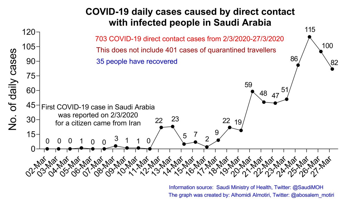 مثلاً يوم ٢٥ مارس تم تسجيل ١١٥ حالة لكنها نقصت في اليومين التاليين إلى١٠٠ حالة و ٨٢ حالة وإن شاء الله ستنحدر بقوة في الأيام القادمة متى تم الإلتزام بالتدابير الوقائية و #منع_التجول .. مقارنة بالدول الأخرى، الوضع مطمئن إن شاء الله..