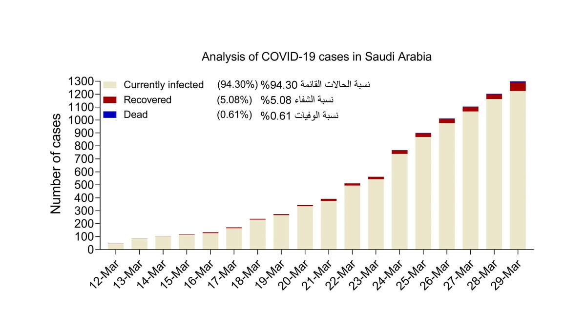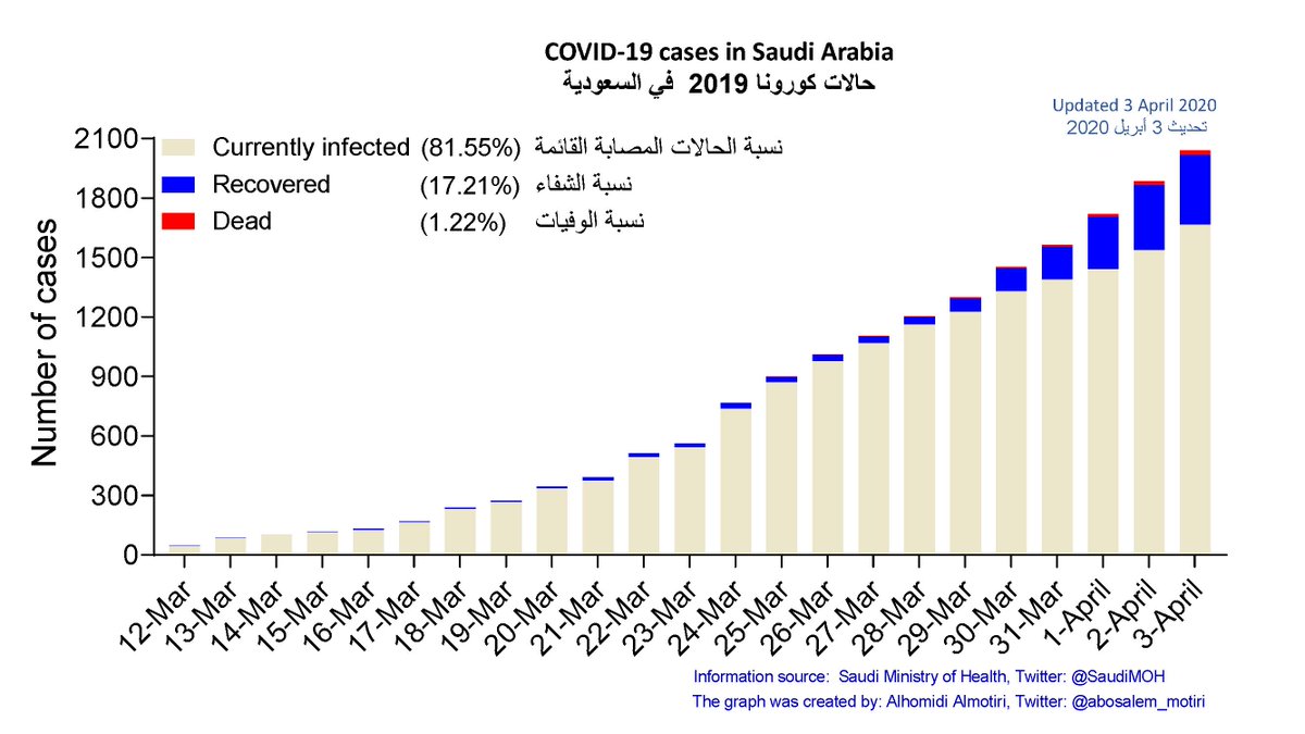 عملت الرسم البياني باللغتين العربية و الإنقليزية وأيضا أضفت كما أشار مشكورا @abdullahalzah23 بإضافة أهم التدابير الوقائية التي اتخذتها الدولة للحد من انتشار الفيروس لتكون الصورة مكتملة للقارىء.. @SaudiMOH