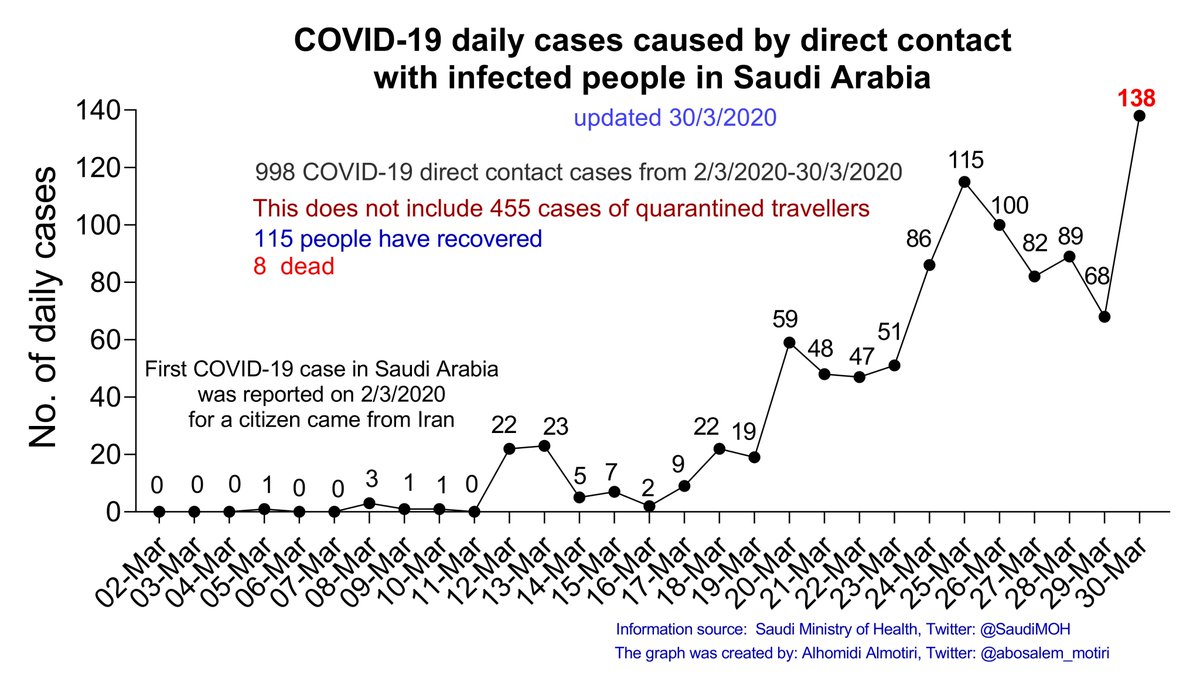 سأضع تحديثات لاحقة لهذا الرسم حسب الحالات التي تعلن عنها وزارة الصحة @SaudiMOH .. وكلي أمل بأن ينحني هذا المنحنى للأسفل في القريب العاجل بفضل الله ثم بجهود المخلصين ووعي المواطنين والمقيمين
