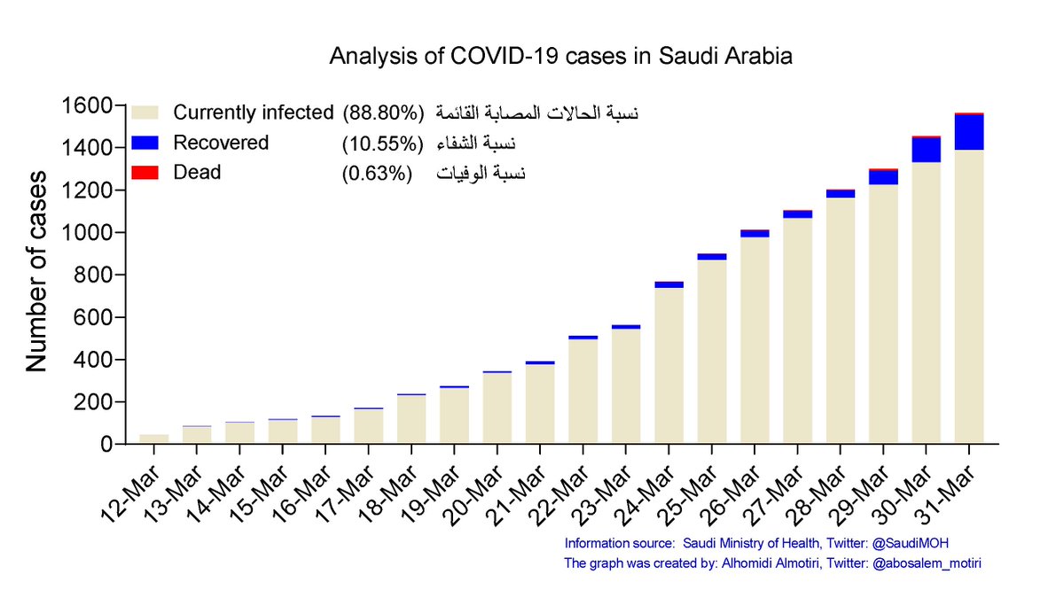 تراوح الأرقام في مدى قصير الأيام الماضية وعدم تضاعفها يبشر بالخير ومؤشر جيد لجدوى التدابير الوقائية التي قامت بها الدولة قبل وصول كورونا للسعودية وأيضاً التدابير التي اتخذت بعد ذلك خلال شهر مارس. الأسبوع القادم سيكون محك حقيقي وسينبئ بالكثير آملاً أن يكون خيرا.
