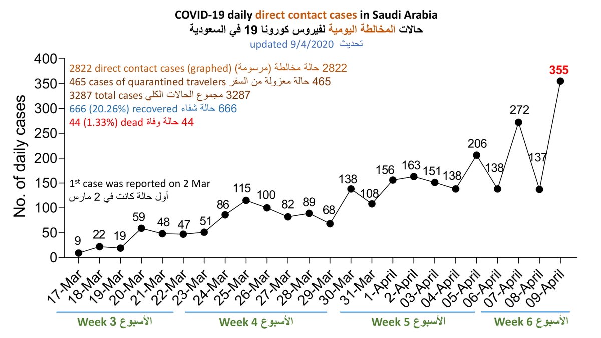 تم تسجيل أعلى عدد إصابات من بداية انتشار الفيروس 355 حالة. وكما أعلن متحدث الصحة عن التوسع في الاختبارات للكشف المبكر قد يكون نتاجه زيادة في عدد الإصابات خلال الأيام القادمة. نسبة الوفيات انخفضت إلى 1.33%. الالتزام والتباعد مهم جدا الفترة القادمة @Biology1802