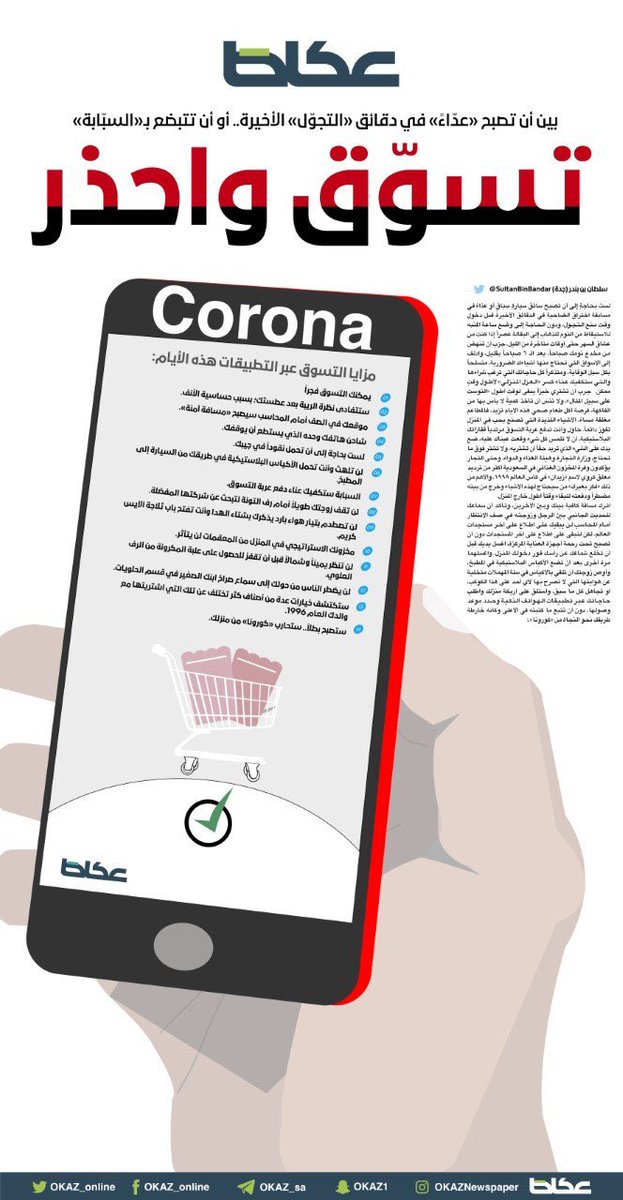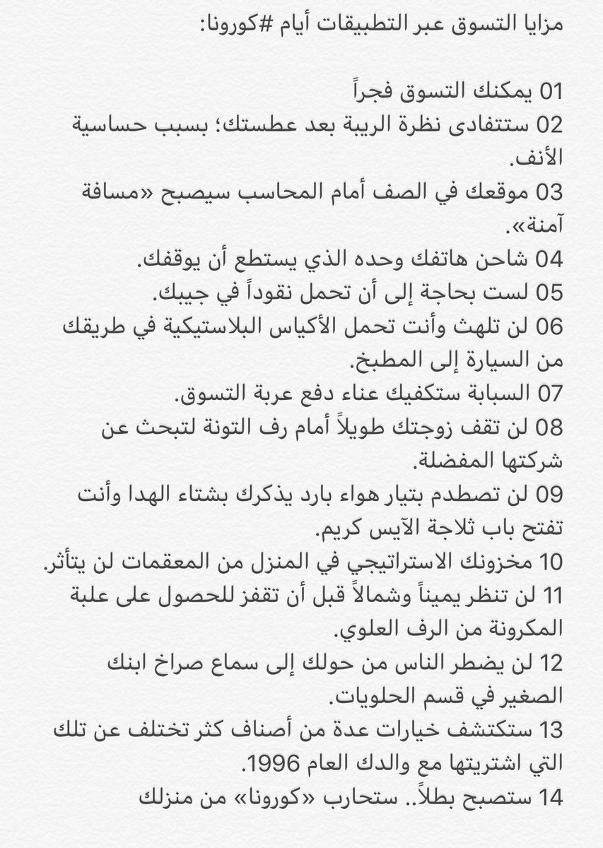 أو تجاهل كل ما سبق، واستلقِ على أريكة منزلك واطلب حاجاتك عبر تطبيقات الهواتف الذكية وحدد موعد وصولها، دون أن تتبع ما كتبته في الأعلى وكأنه خارطة طريقك نحو النجاة من «#كورونا».!