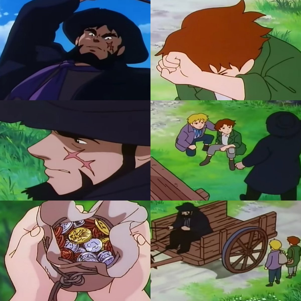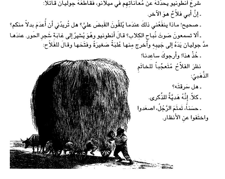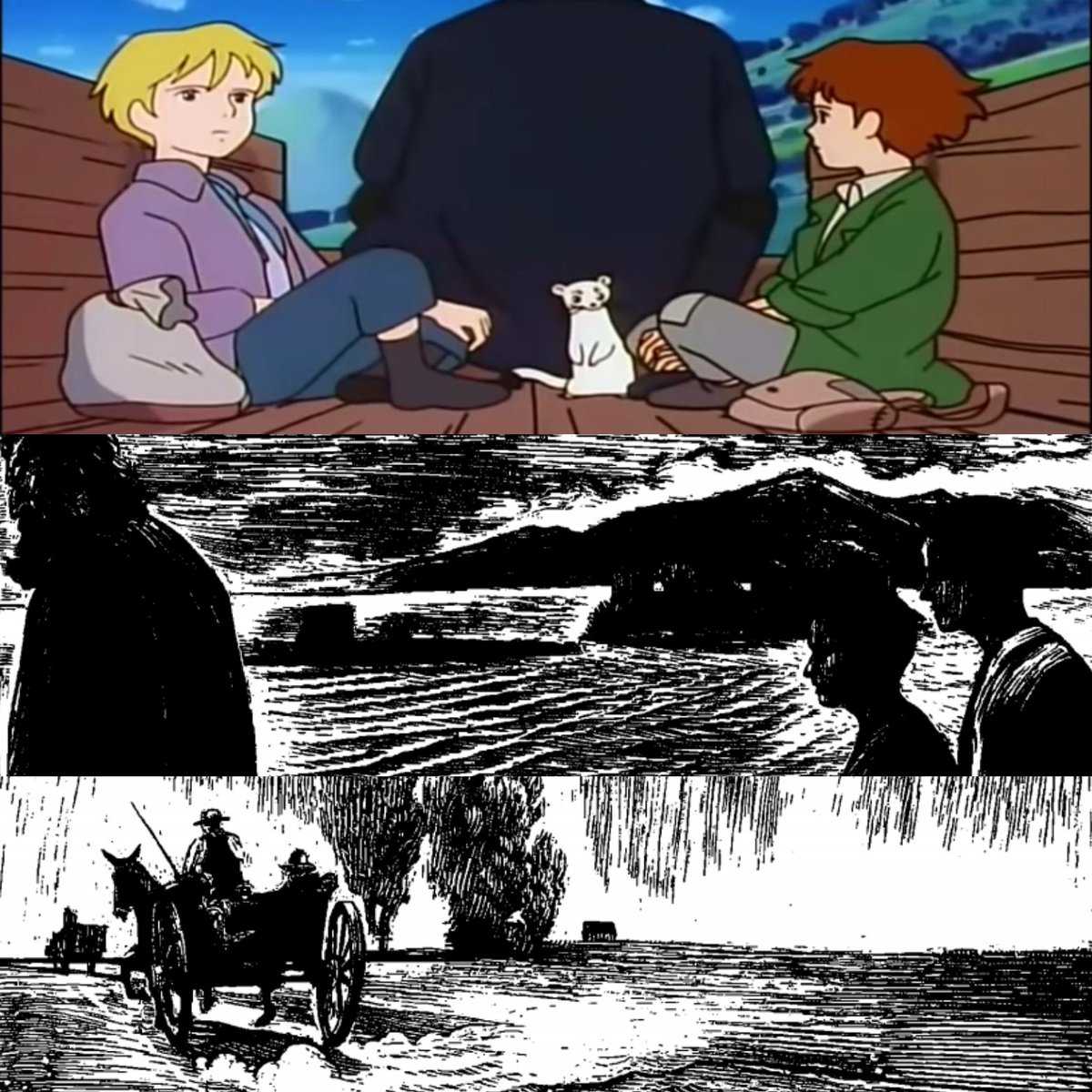 في الأنمي يذهبون على العربة التي اشتراها الرجل الغراب، أما في الرواية يبدؤون رحلتهم إلى ميلانو مشياً وفي اليوم التالي خلال مشيهم يركبون عربة عرض مالكها على الولدين الركوب وأركب الرجل الغراب خلفهم