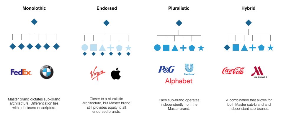 المطلعين على الموضوع يعرفون ان السالفة تحيّر لأن التعريفات والتسميات وحتى الأمثلة تختلف وتختلط..بعضهم حط ٣ عناصر للـ brand architecture وبعضهم ٤ وبعضهم ٥. شخصياً أفصلها كعنصرين الأول House of Brands والثاني Branded House