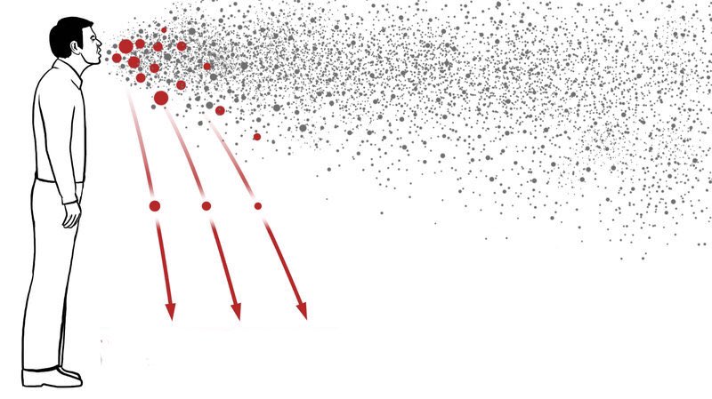 6/ وفقا لتصور لويز ، عند الزفير تنبعث قطرات معزولة (كل قطرة متفردة بذاتها). تستقر القطرات الكبيرة بشكل أسرع مما تتبخر ، مما يلوث المنطقة المجاورة للفرد المصاب. بينما في المقابل ، تتبخر القطرات الصغيرة أسرع مما تستقر.