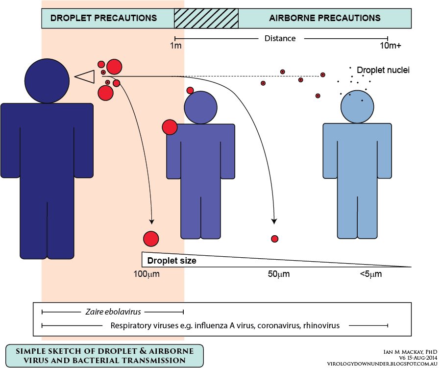 4/ كان يُعتقد أن "انتقال القطيرات" وهو انتقال الامراض عن طريق ملامسة السوائل المقذوفة اثناء الكلام او العطس او الكحة و المحملة بالجراثيم هو الطريق الرئيسي لانتقال الأمراض التنفسية.