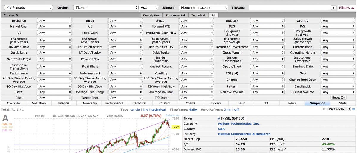 Finviz | يمكنك الموقع من البحث (تصفية) الأسهم بحسب القطاع / حجم الشركة / توصية المحللين / نسبة التوزيعات / مكرر الربح و غيرها من التصفيات