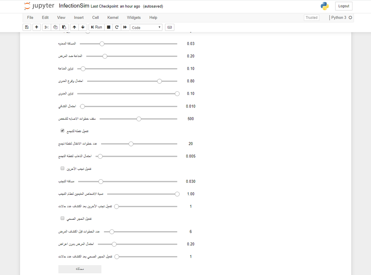 استغليت الويكند في كتابة برنامج لعمل #محاكاة لانتشار #الأوبئة تحت عدة متغيرات يتحكم بها المستخدم، كاحتمالية نقل العدوى والمناعة بالاضافة لحركة الناس و #الحجر_الصحي. وعلى الرغم بأنني لست عالم أمراض معدية، إلا أن المحاكاة ساعدتني في فهم تأثير القرارات المختلفة