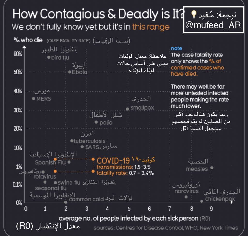 نعود للوباء الحالي فيروس كورونا الذي يبلغ معدل الانتشار له (R0=2-3) بمعنى أن الشخص المصاب به قد ينقل العدوى لشخصين أو ثلاثة، ولفهم الموضوع نقارنه بـ الانفلونزا الموسمية (R0= 1.4) لتشابه طرق الإنتقال وكذلك الأعراض بينهم.