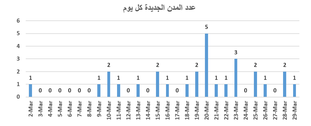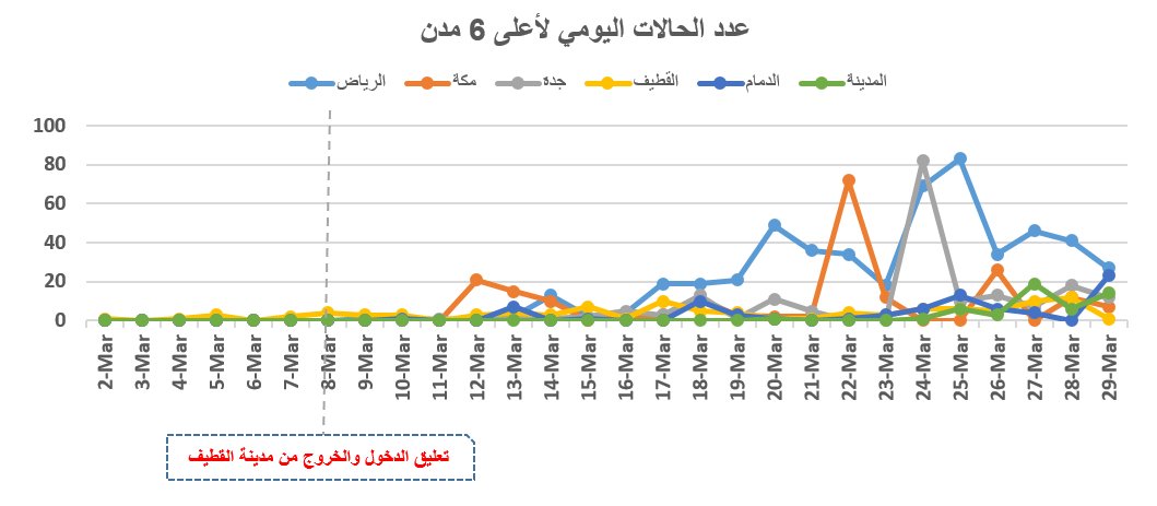 على مستوى المدن وصل #كورونا 28 مدينة، الرياض الأعلى بـ 518 حالة تليها مكة (199) ثم جدة (185) ثم القطيف (103) ثم الدمام (79) وبعدها المدينة التي سجلت 50 حالة ، ويُلاحظ التأثير الإيجابي لقرار إغلاق مدينة القطيف على تناقص الحالات فيها.